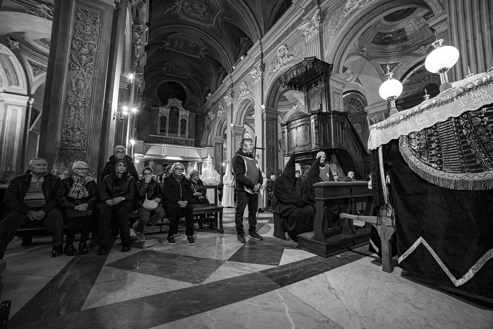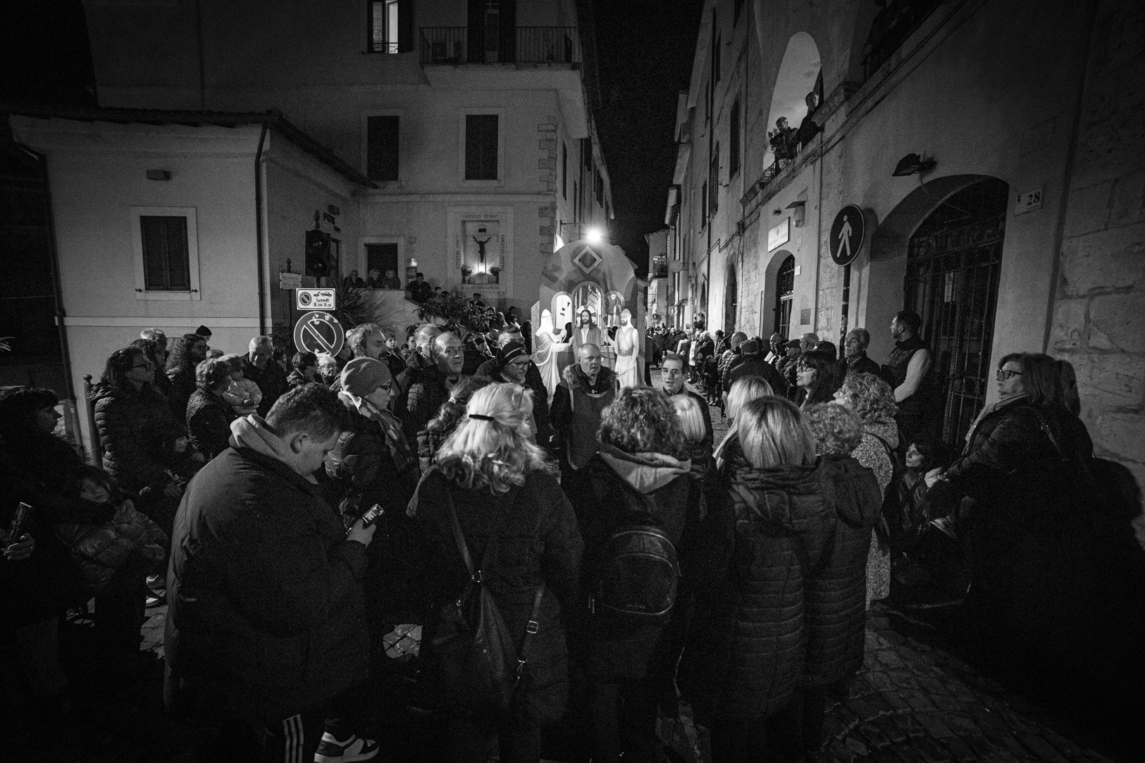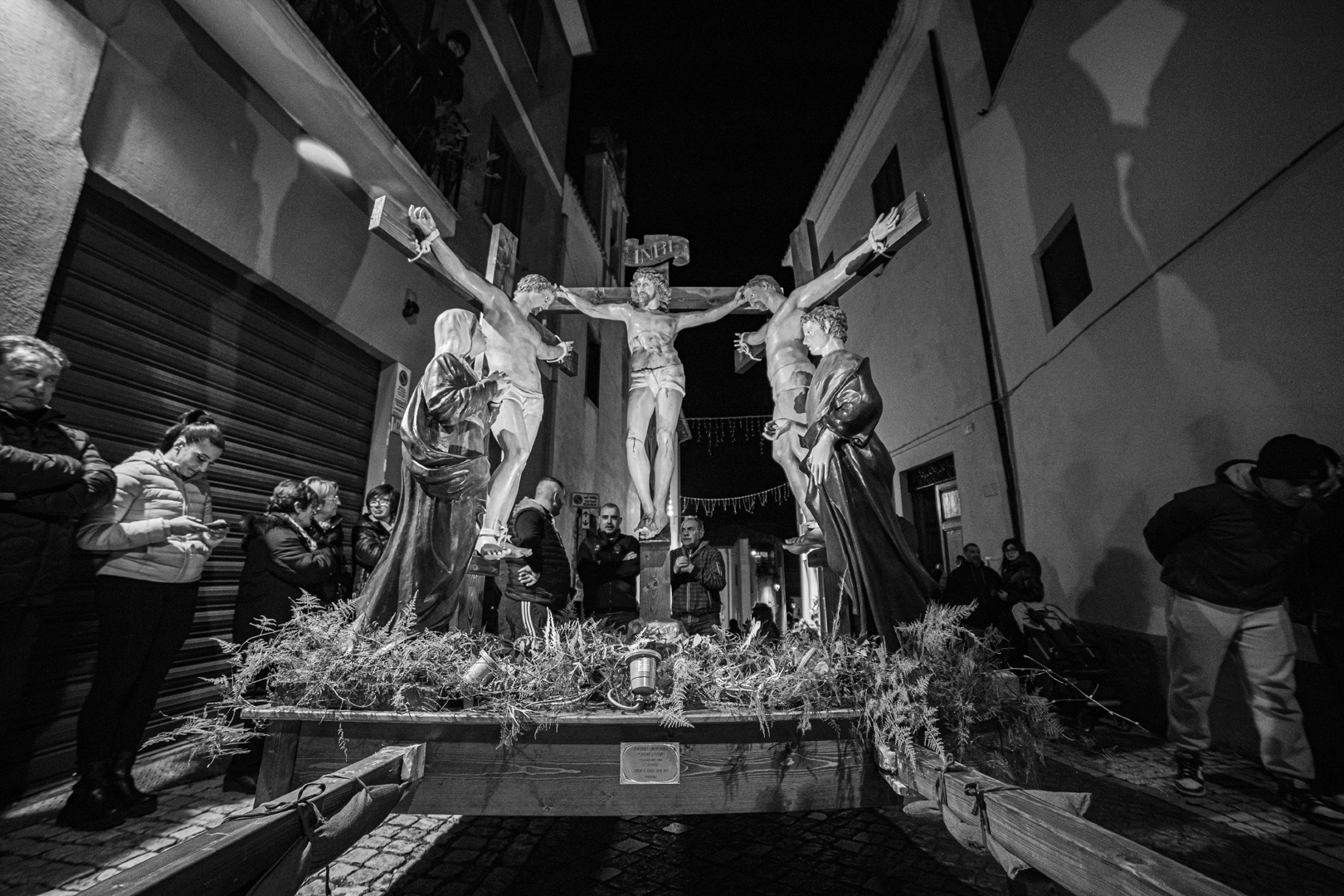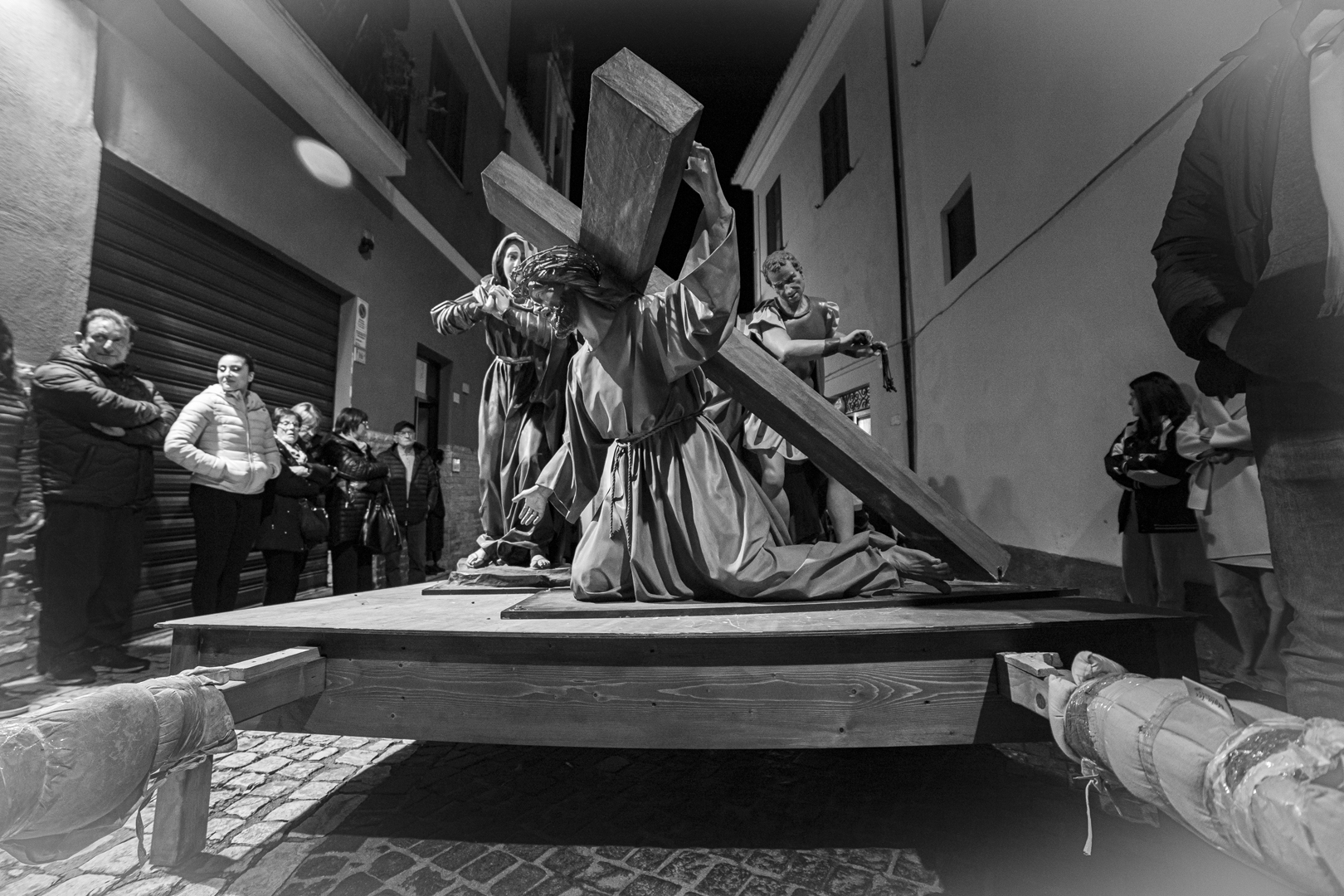 Il progetto nasce dalla voglia di documentare la storia secolare di questa tradizione cristiana, ossia la rappresentazione della passione di Cristo. Dopo una particolare cerimonia che si tiene all'interno della cattedrale di Santa Maria Assunta, il corteo prende vita incamminandosi verso l'uscita dove, prima della discesa suggestiva sulla lunga scalinata avviene un momento di raccoglimento. La macchina, ospitante il Cristo morto, viene preceduta dai cosiddetti "sacconi": personaggi incappucciati dalla tunica bianca e dalla tunica nera, questi ultimi incatenati per espiare i loro peccati. Una volta giunti nella centrale piazza, il corteo, completo di "quadri" prende il via per il centro storico del paese effettuando le quattordici fermate della Via Crucis dove ciascuna delle Confraternite intona canti dedicati al "quadro" che accompagnano. Ultima a calpestare il selciato del percorso è la banda comunale ricca di fiati e percussioni. Ogni sera del Venerdì Santo si rinnova questa antica tradizione religiosa particolarmente sentita dalla popolazione privernate. Il documento fotografico riportato, tende a valorizzare questa antica tradizione e ad enfatizzare l'effetto scenico dei "commedianti", tutti attori non professionisti ma accomunati da un grandissimo senso di attaccamento al territorio privernate e di seguire le impronte lasciate prima di loro dai loro progeniti.
