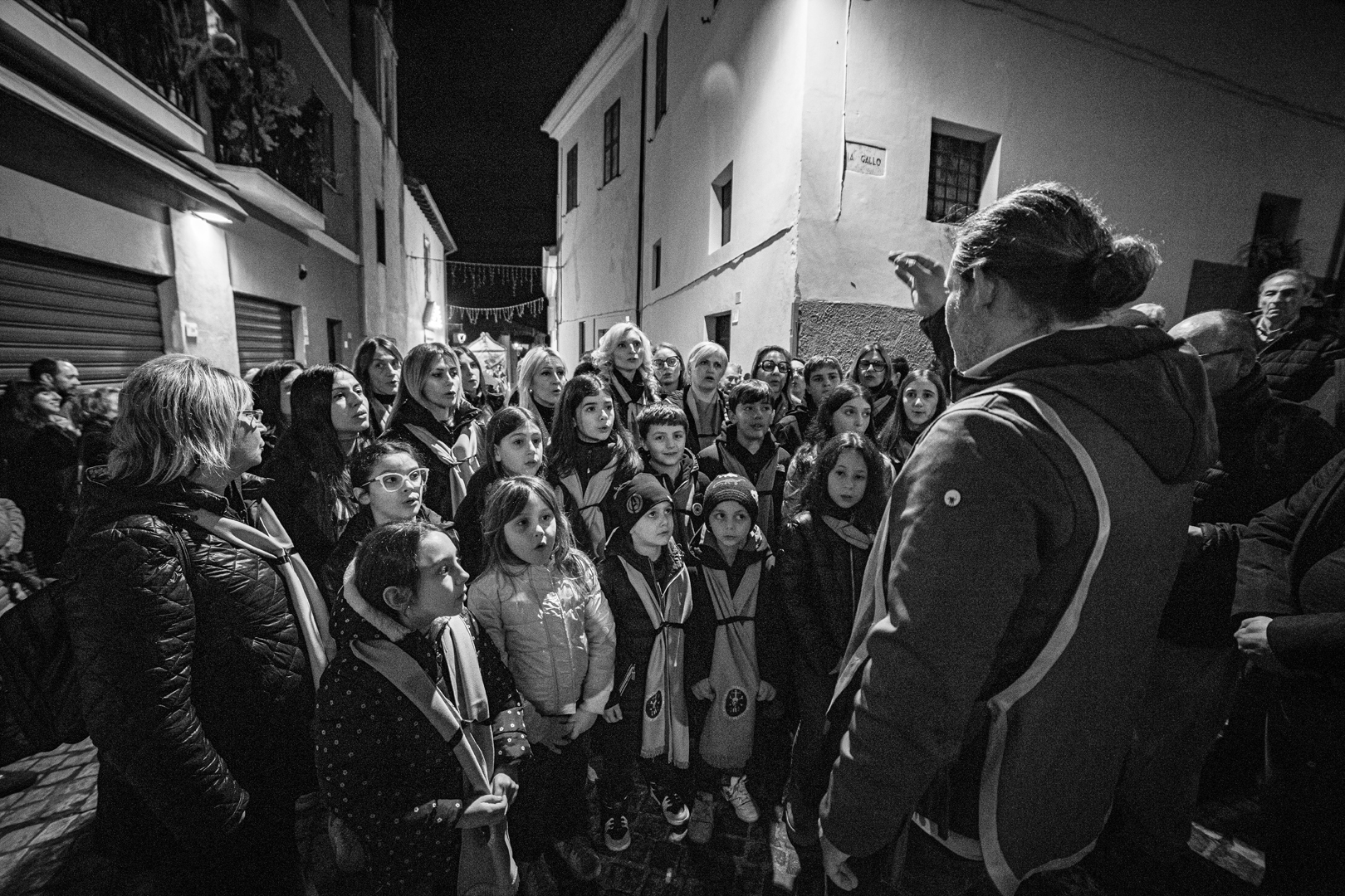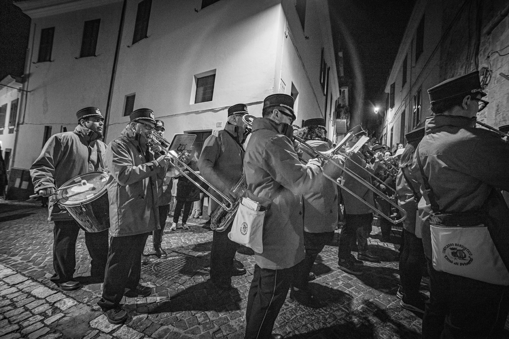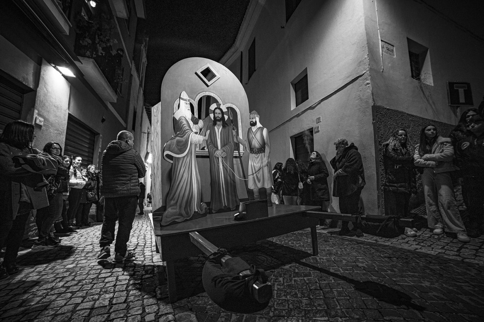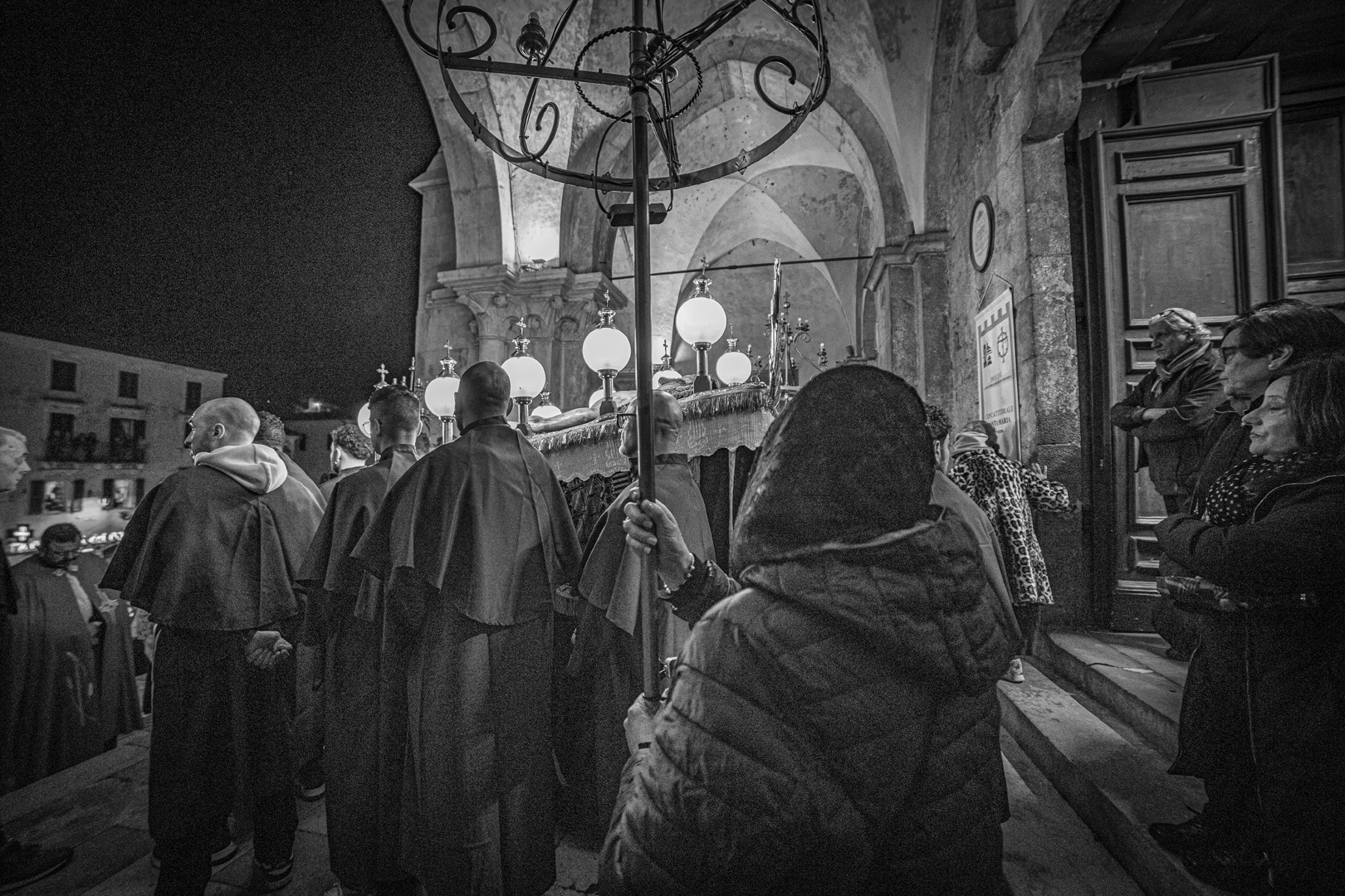 Il progetto nasce dalla voglia di documentare la storia secolare di questa tradizione cristiana, ossia la rappresentazione della passione di Cristo. Dopo una particolare cerimonia che si tiene all'interno della cattedrale di Santa Maria Assunta, il corteo prende vita incamminandosi verso l'uscita dove, prima della discesa suggestiva sulla lunga scalinata avviene un momento di raccoglimento. La macchina, ospitante il Cristo morto, viene preceduta dai cosiddetti "sacconi": personaggi incappucciati dalla tunica bianca e dalla tunica nera, questi ultimi incatenati per espiare i loro peccati. Una volta giunti nella centrale piazza, il corteo, completo di "quadri" prende il via per il centro storico del paese effettuando le quattordici fermate della Via Crucis dove ciascuna delle Confraternite intona canti dedicati al "quadro" che accompagnano. Ultima a calpestare il selciato del percorso è la banda comunale ricca di fiati e percussioni. Ogni sera del Venerdì Santo si rinnova questa antica tradizione religiosa particolarmente sentita dalla popolazione privernate. Il documento fotografico riportato, tende a valorizzare questa antica tradizione e ad enfatizzare l'effetto scenico dei "commedianti", tutti attori non professionisti ma accomunati da un grandissimo senso di attaccamento al territorio privernate e di seguire le impronte lasciate prima di loro dai loro progeniti.